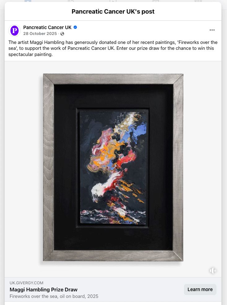 Pancreatic Cancer UK (PCUK) secured a donated artwork from renowned British artist Maggi Hambling. The artwork was offered as the prize in an online draw hosted on the Givergy platform. A total of 5,000 tickets were available at £15 each, with a free entry route provided in line with regulations.